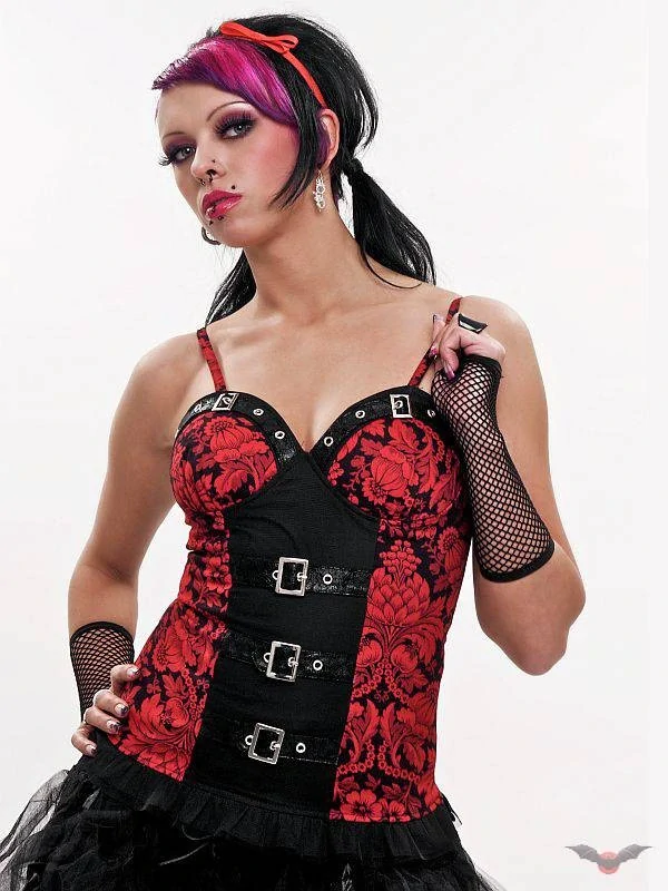 Kvalitní dámský korzet červenočerný s květinovým potiskem, velikost S. Materiál: 95% bavlna, 5% lycra