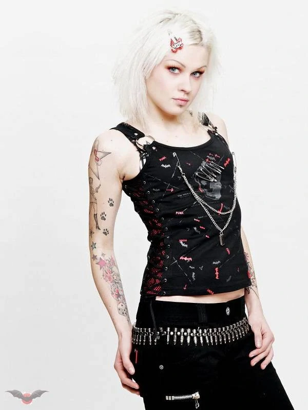 Dámský top představuje tisk netopýrů šedé a červené, kříže s ostnatým drátem. Na přední straně je šedá lebka stejně jako zavírací špendlíky a řetězy. Popruhy jsou upevněny vpředu se dvěma velkýma chromovanýma kroužkama. Velikost S – XL. Materiál: 95% bavlna, 5% lycra, potisk drobní netopýři